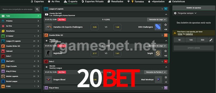O 20Bet oferece uma grande seleção de opções de apostas em e-sports com probabilidades competitivas